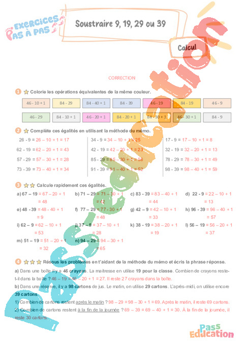 Correction Soustraire 9, 19, 29 ou 39 : Primaire 3 – Exercices Pas à Pas rtf