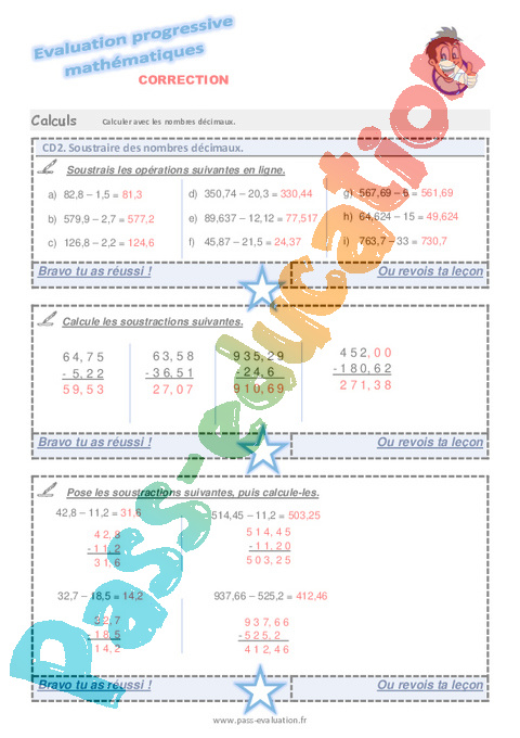 Soustraire des nombres décimaux en Primaire 5 – Evaluation progressive – Correction pdf