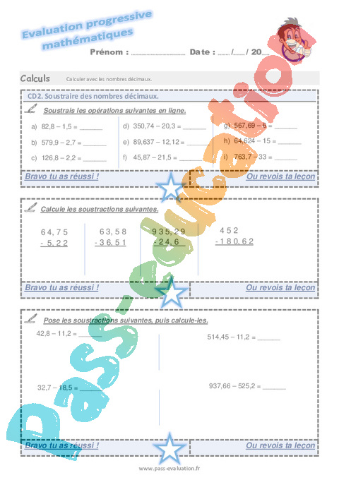 Evaluation progressive en Primaire 5 : Soustraire des nombres décimaux