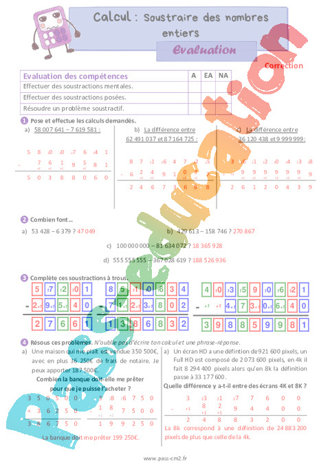 Evaluation Correction : Primaire 5 Soustraire des nombres entiers pdf