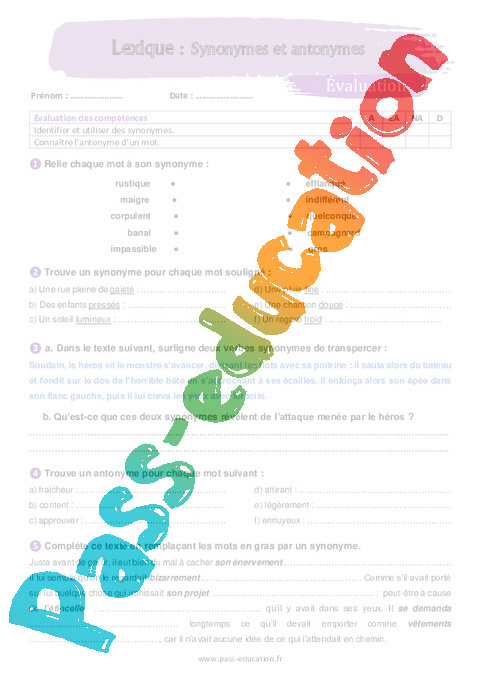 Evaluation avec la correction pour la Secondaire 1 sur les synonymes et antonymes.