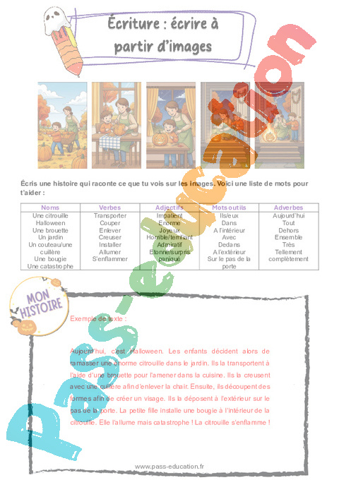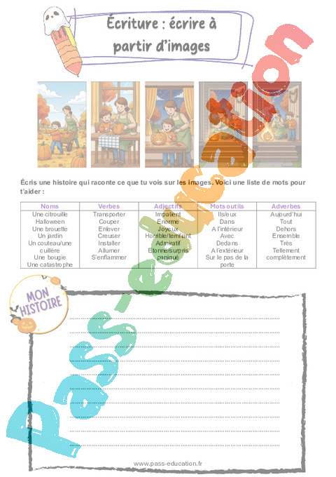 Ecris une histoire qui raconte ce que tu vois sur les images. Voici une liste de mots pour t’aider :
