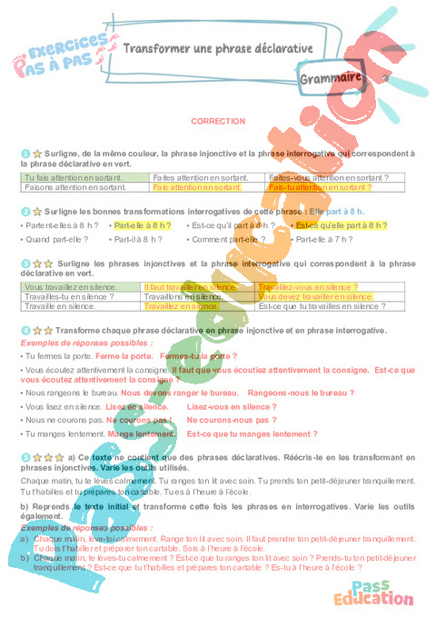 Correction Transformer une phrase déclarative : Primaire 5 – Exercices Pas à Pas pdf