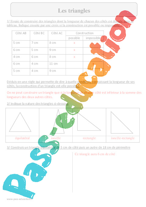 1/ Essaie de construire des triangles dont la longueur de chacun des côtés est donnée dans le tableau. Indique ensuite par une croix si la construction est possible ou impossible :