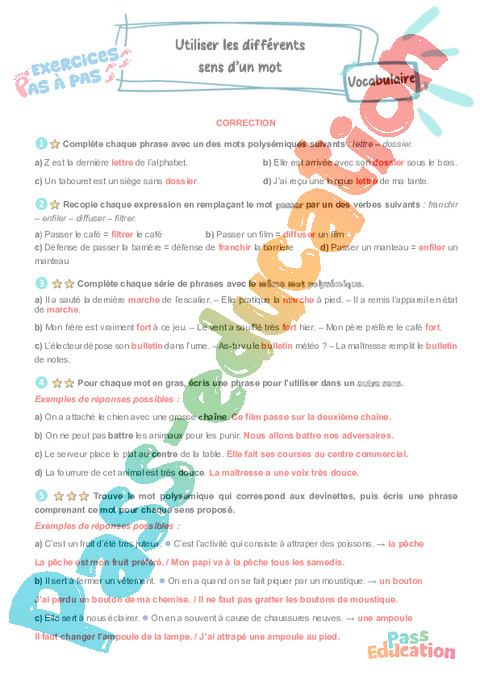 Correction Utiliser les différents sens d’un mot : Primaire 5 – Exercices Pas à Pas rtf