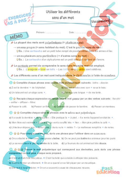 Exercices Pas à Pas avec mémo / leçon de vocabulaire pour travailler la compétence : Utiliser les différents sens d’un mot au : Primaire 5 .