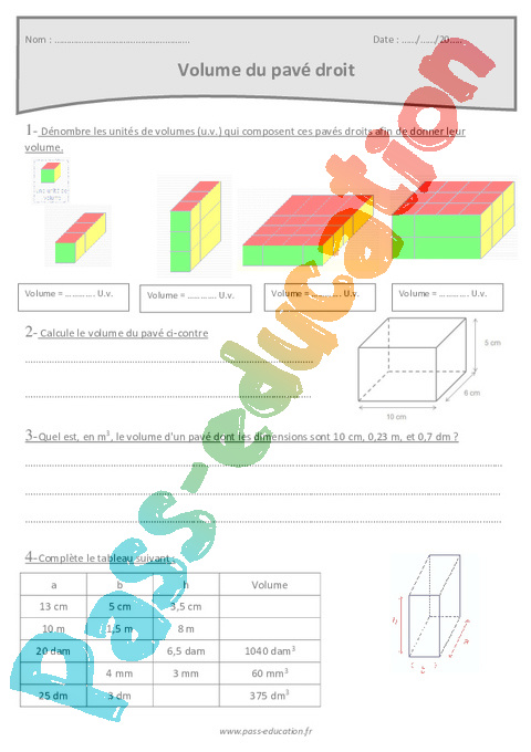 Volume du pavé droit : Primaire 6 – Exercices à imprimer rtf